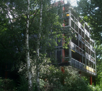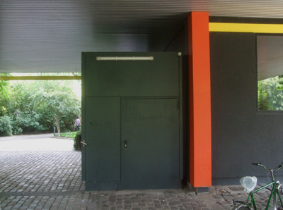 Than we continue our walk and go to the Spree shore, to the experimental prefab steel house of Jochen Brandi and Partners (1974-77) at Schleswiger Ufer 6-8 and to the Evangelisches Konsortium by Georg Heinrichs and Hans Christian Müller, built in 1964-1970, in Backstraße 1-2 right next to it, their second Neopren house.