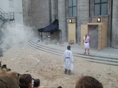 Agora, the open air theatre in front of the main entrance of the Volksbühne, while the building was under renovation. It's a simple structure made with containers and scaffolding with a wooden fence. The stage was the entrance facade plus some tons of sand.